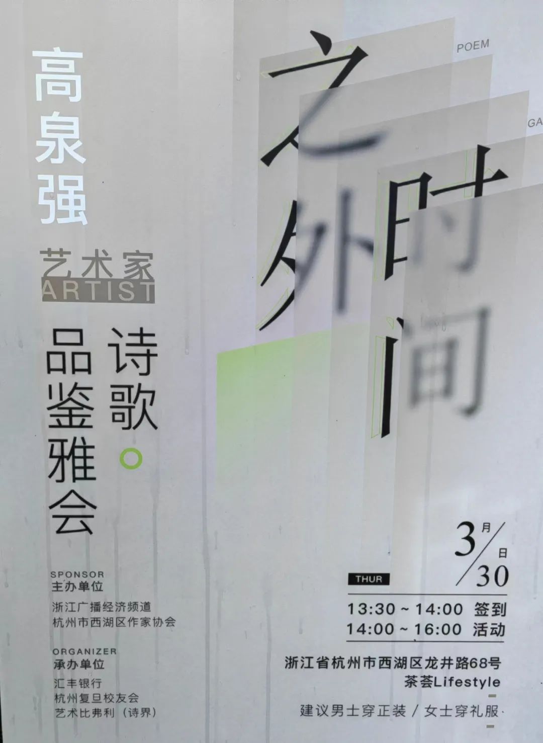 3月30日下午,由浙江广播经济频道、杭州市西湖区作家协会主办,汇丰银行、杭州复旦校友会、艺术比弗利(诗界)承办的我会文化专委会顾问、艺术家高泉强先生“时间之外”诗歌品鉴雅会,在西子湖畔“茶荟”艺术空间举行。西湖区作家协会主席,浙江广播经济频道主任,著名诗人梁晓明以及来自文艺界的艺术大咖100余人,参加了本次艺术盛宴。