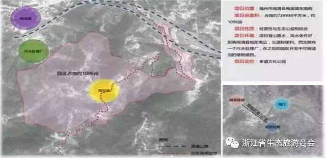 据了解,福州九龙生态园项目选址闽清县梅溪镇,规划用地1096亩,计划总投资10亿元。项目计划在原梅山陵园的基础上,升级产业模式,打造一座集旅游观光、生态养老、休闲农业、亲子乐园、华侨纪念园、生命教育、祭祀怀念为一体的福州市城市孝道文化公园。同时,计划用5年时间建成包括游客中心、孝道民街、华侨广场、名人博物馆、天鹅湖、林田花海等48处景观的孝文化景区。根据规划,首期将建设旅客服务中心、老年养生中心、办公楼、孝道名街、孝道文化广场等。