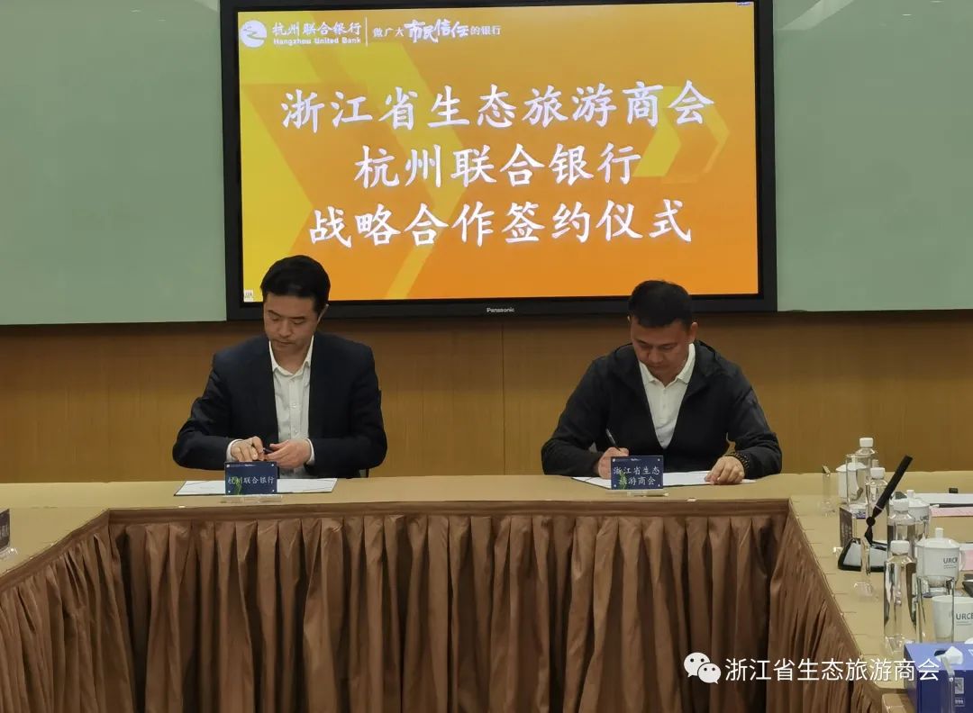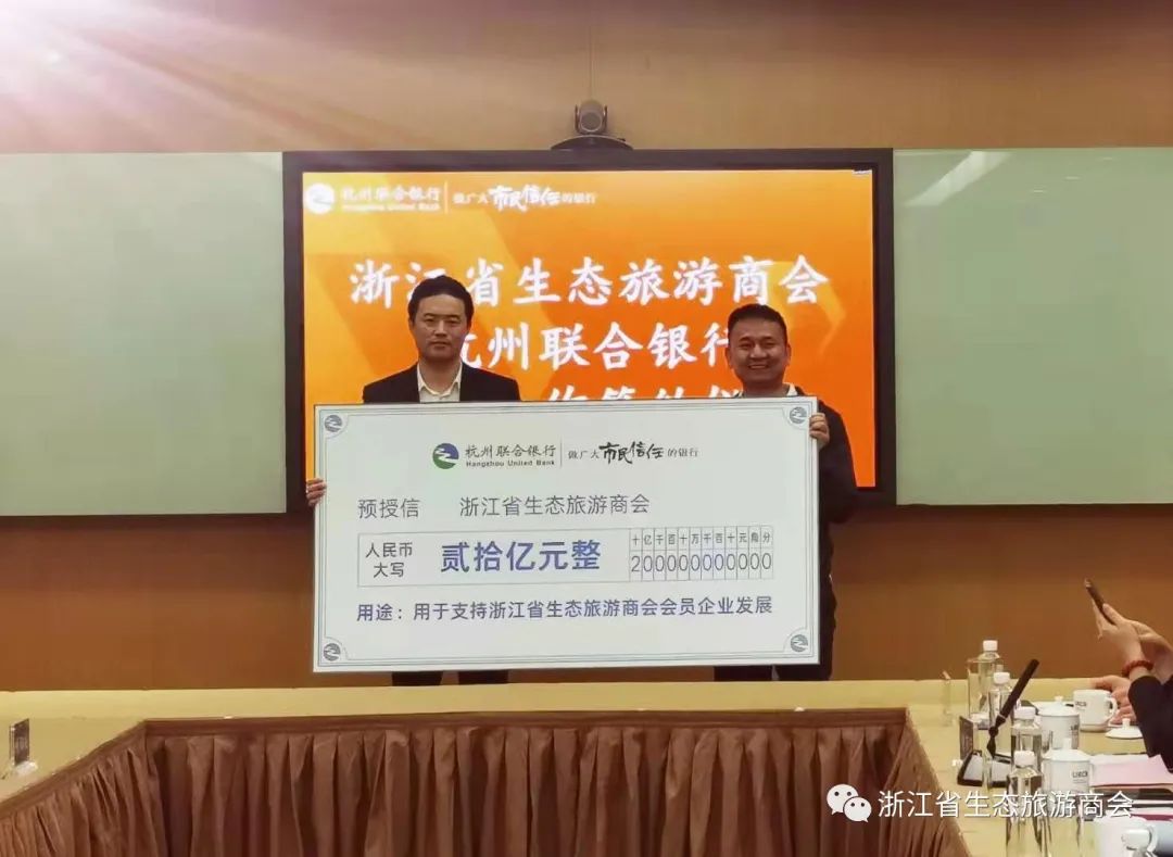 期间,杭州联合银行副行长卢宏泳与浙江省生态旅游商会会长黄光权签订战略合作协议,杭州联合银行为浙江省生态旅游商会预授信20亿元,用于支持浙江省生态旅游商会会员企业发展。