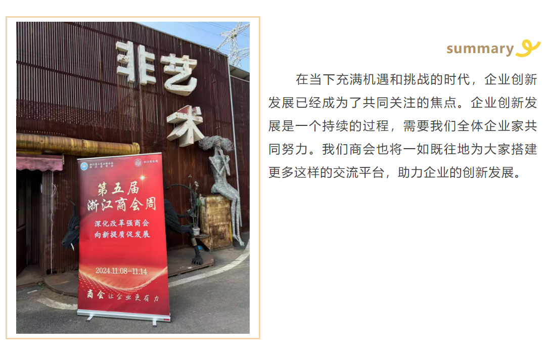 《企业创新发展》主题沙龙。本次沙龙特邀请商会监事长单位杭州御湘湖国际健康城总裁秘书徐雪峰,会员单位杭州柏宁文化有限公司总经理黄宁为大家作专题分享。