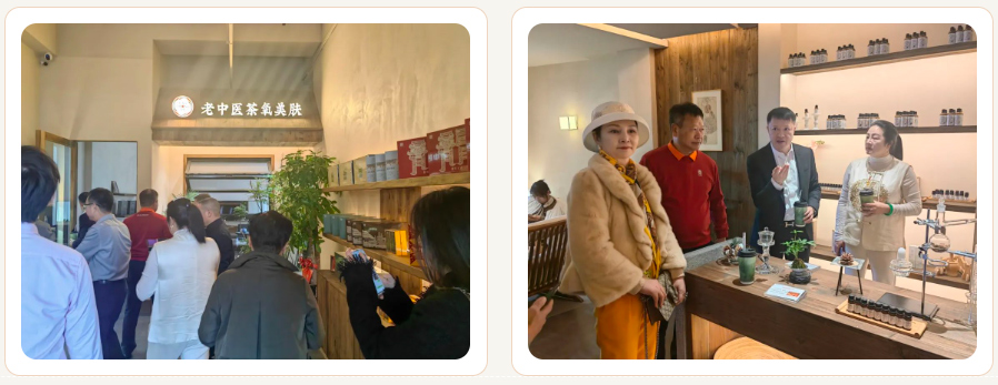 参观考察第二站是“长生老号”省级非遗茶空间。非遗茶空间以中医药和茶文化为核心,融合苍南非遗及本地传统文化,形成了极具东方韵味和本地特色的新中式茶美学空间。中药奶茶“见青山”,将中药与奶茶的融合,不仅让奶茶变得更加健康,也让中药以更加亲和、时尚的方式走进年轻人的生活。